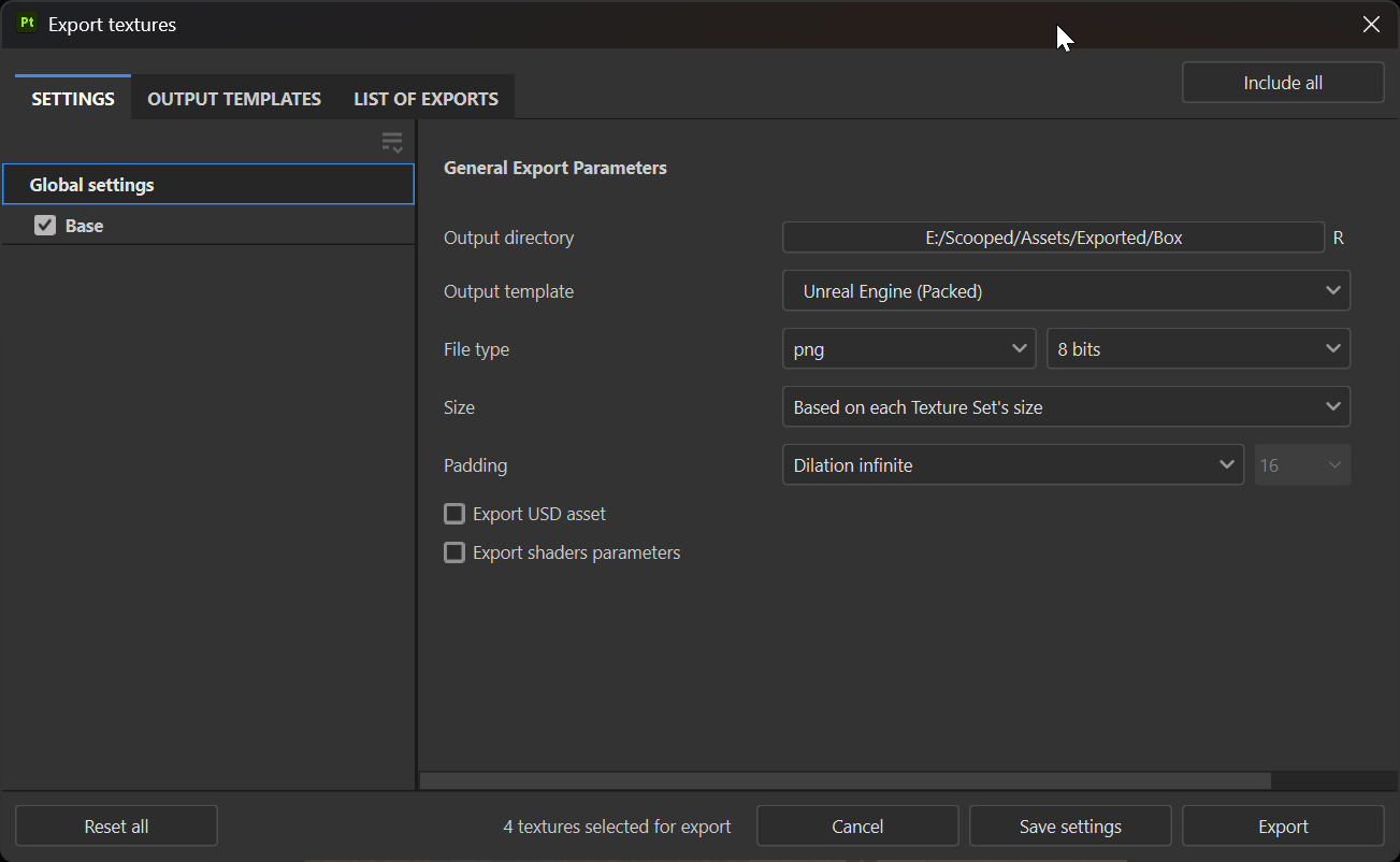 In Substance Painter, go to File > Export Textures, select your output directory, and choose the Unreal Engine (packed) template. Hit Export.